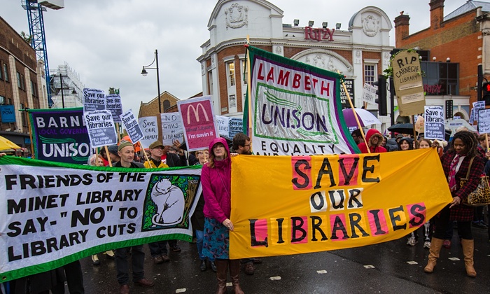 Biblioteki publiczne w Wielkiej Brytanii znalazły się w trudnej sytuacji. Część placówek jest zamykanych, a czas działaności pozostałych bibliotek jest stopniowo skracany. Dodatkowo redukowane są także etaty bibliotekarzy. Ministerstwo Kultury, Mediów i Sportu zostało oskarżone o zaniedbywanie ich obowiązku wynikającego z ustawy o bibliotekach publicznych i muzeach z 1964 roku.