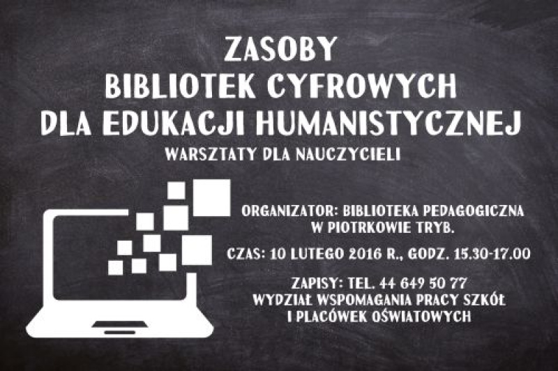 Zapraszamy serdecznie nauczycieli, bibliotekarzy oraz wszystkich zainteresowanych na bezpłatne szkolenie pn. "Zasoby bibliotek cyfrowych dla edukacji humanistycznej”, które odbędzie się 10.02.2016 roku o godz. 15.30 w Bibliotece Pedagogicznej w Piotrkowie Trybunalskim.