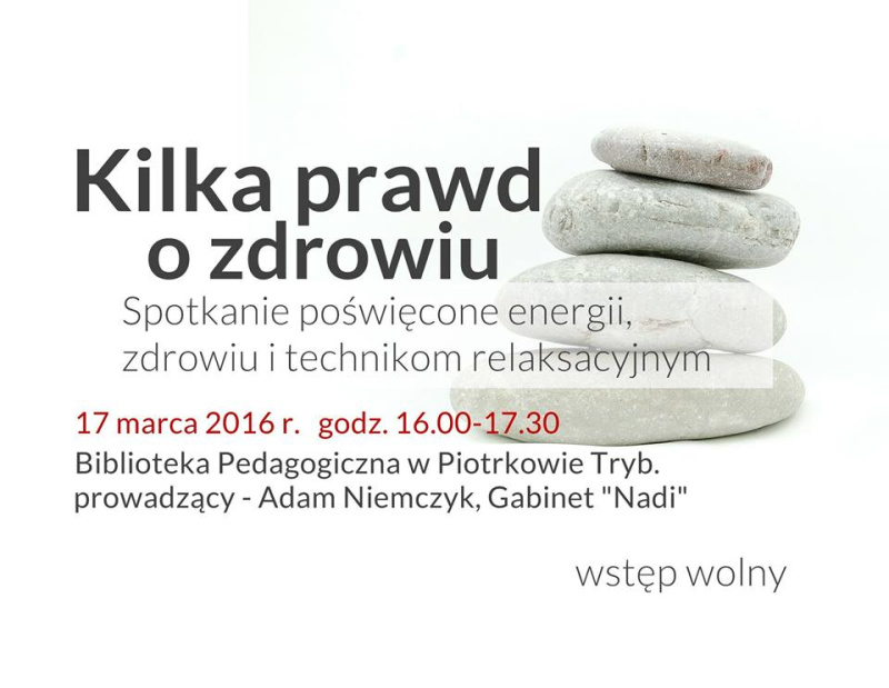 W ramach przedsięwzięcia pod nazwą "Trzecie miejsce" już w marcu w Bibliotece Pedagogicznej rozpocznie się cykl nowych warsztatów o zdrowiu i medytacji. Wszystkich zainteresowanych zapraszamy na pierwsze spotkanie już 17 marca o godz. 16.00. Poprowadzi je Adam Niemczyk z gabinetu terapii holistycznych „Nadi” w Piotrkowie Trybunalskim. Spotkanie poświęcone będzie energii, zdrowiu i technikom relaksacyjnym. Wstęp wolny!