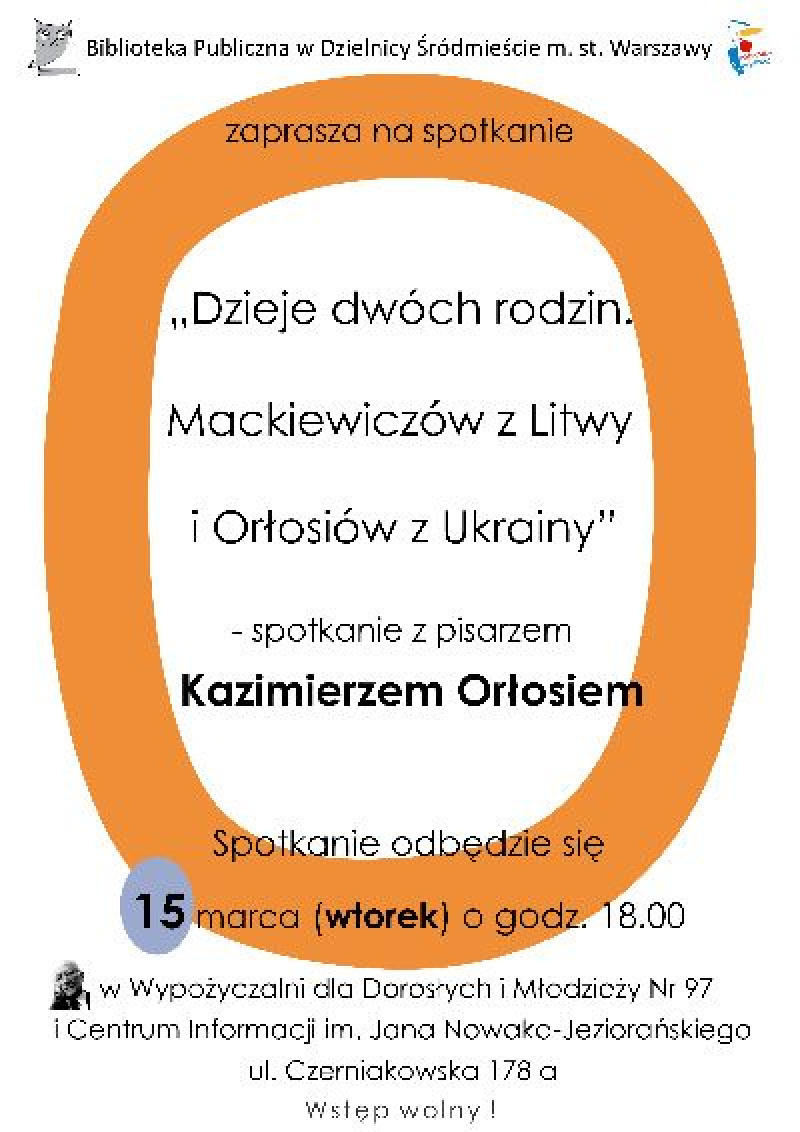 zaprasza na spotkanie z Kazimierzem Orłosiem pt. "Dzieje dwóch rodzin. Mackiewiczów z Litwy i Orłosiów z Ukrainy"