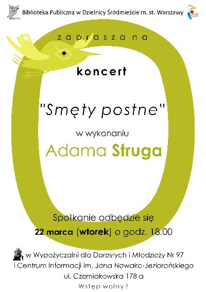 zaprasza na koncert pt. "Smęty postne" w wykonaniu Adama Struga - śpiewaka i instrumentalisty, poety, autora piosenek, kompozytora muzyki teatralnej i filmowej, etnomuzykologa, pomysłodawcy zespołu śpiewaczego "Monodia Polska" praktykującego polskie pieśni przekazywane w tradycji ustnej.