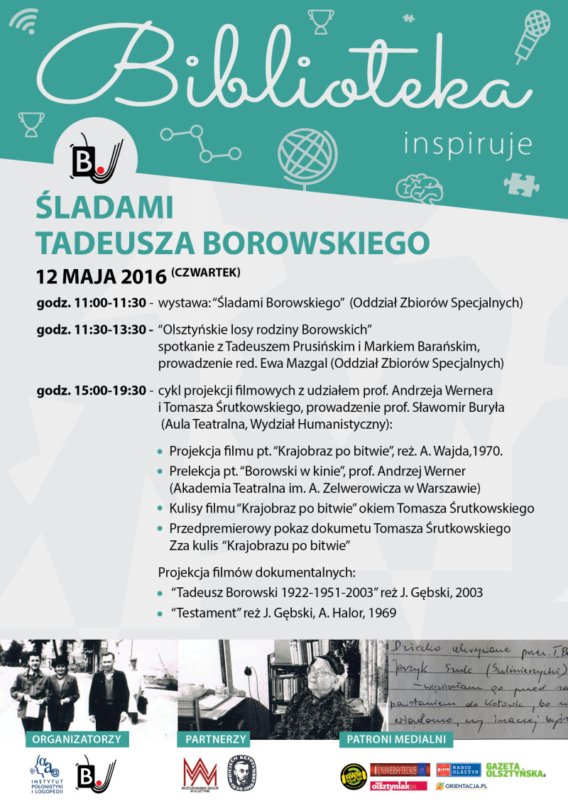 Na wspomnieniową wycieczkę śladami Tadeusza Borowskiego można będzie udać się w czwartek 12 maja. W tym dniu na patio Biblioteki odbędzie się czytanie twórczości znanego pisarza, zaś później nastąpi zaprezentowanie wystawy „Śladami Borowskiego” oraz spotkanie z Tadeuszem Prusińskim oraz Markiem Barańskim w ogrodzie zimowym. Po godzinie 15. na Wydziale Humanistycznym wyświetlony zostanie cykl projekcji filmowych, który połączony będzie z prelekcjami prowadzonymi przez Prof. Sławomira Buryłę.