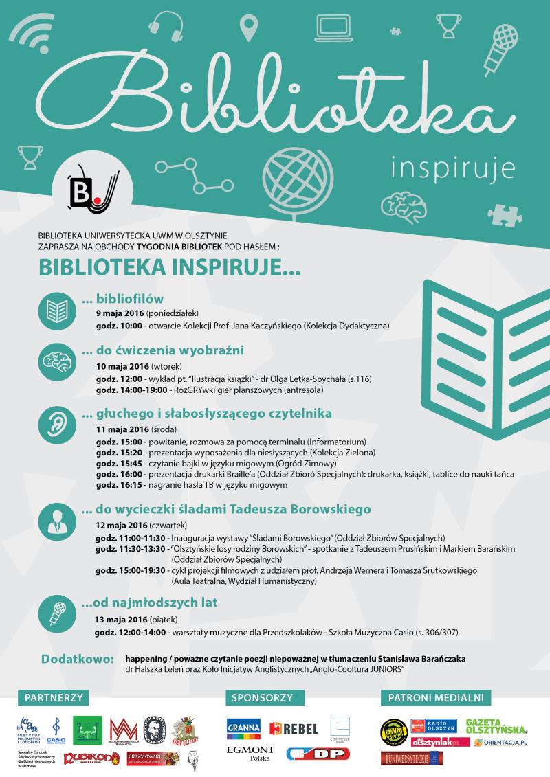 Biblioteka UWM w Olsztynie w ramach Tygodnia Bibliotek zaprasza na cykl kulturalnych wydarzeń. W poniedziałek 9 maja odbędzie się inauguracja TB pod hasłem Biblioteka inspiruje… bibliofilów. Będzie to nowość w bibliotece – ekspozycja bogatej kolekcji udostępnionej przez zasłużonego profesora dr hab. Jana Kaczyńskiego.