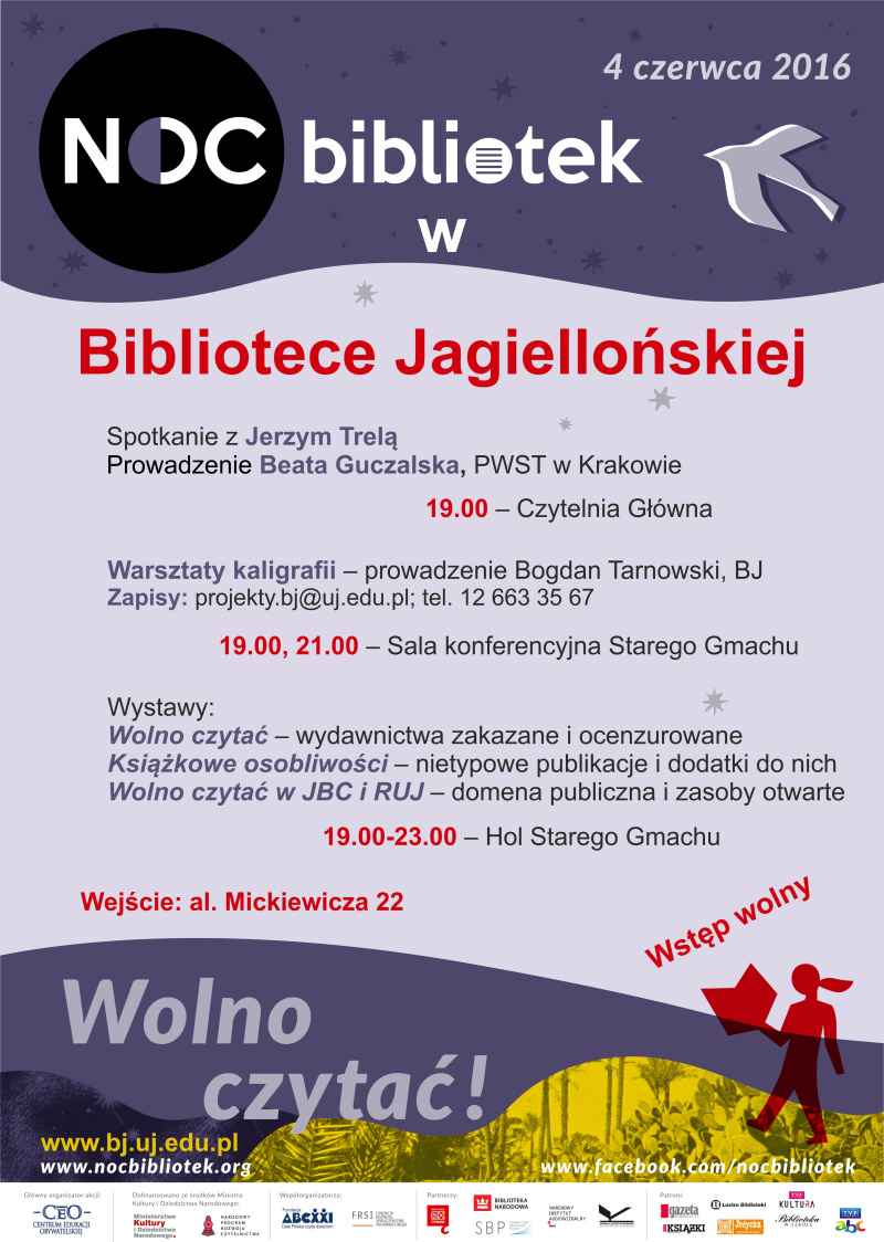 w ogólnopolskiej NOCY BIBLIOTEK, organizowanej 4 czerwca 2016 r., w godz. 19.00-23.00. W ramach akcji Biblioteka Jagiellońska zaprezentuje odwiedzającym niedostępny zwykle, zabytkowy hol Starego Gmachu i otworzy zamknięte na co dzień wejście od al. Mickiewicza 22.