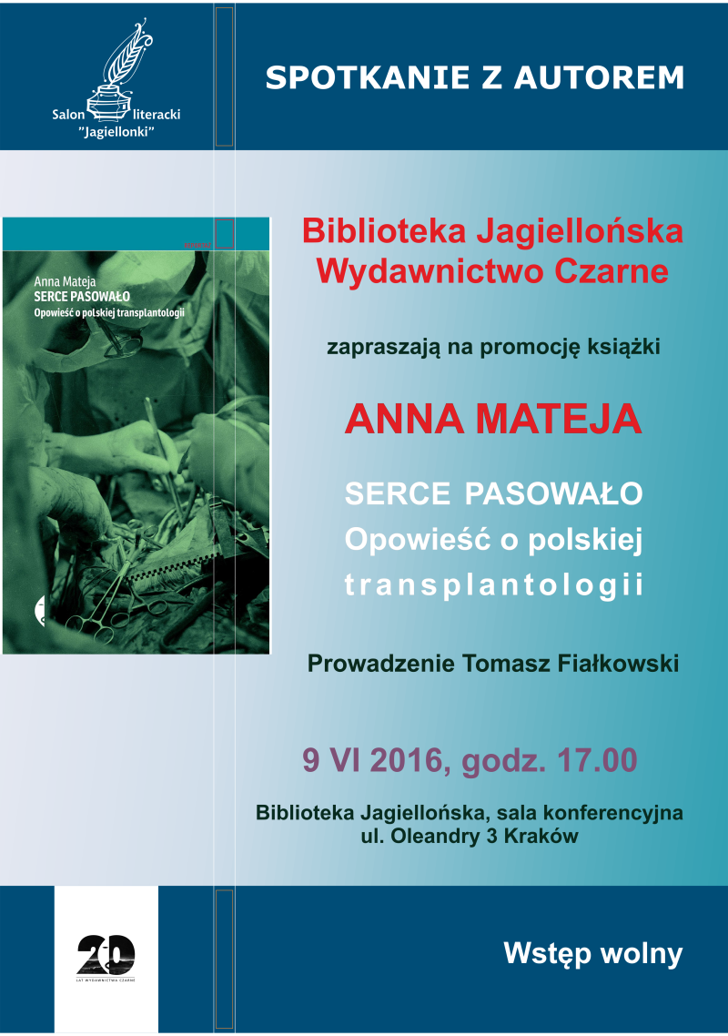 Biblioteka Jagiellońska i Wydawnictwo Czarne w Krakowie zapraszają 09.06.2016, o godz. 17.00 na spotkanie z Anną Mateją, autorką książki „Serce pasowało. Opowieść o polskiej transplantologii”. Rozmowę poprowadzi Tomasz Fiałkowski.