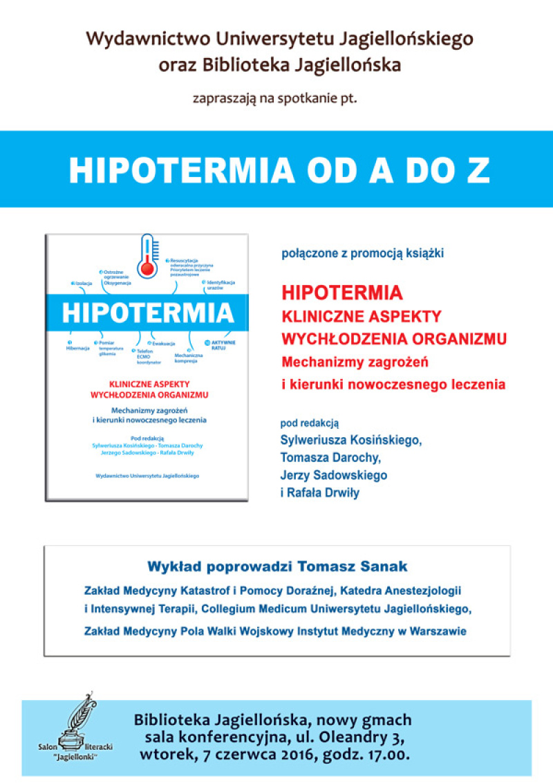 Biblioteka Jagiellońska i Wydawnictwo Uniwersytetu Jagiellońskiego zapraszają 07.06.2016, o godz. 17.00 na spotkanie pt. Hipotermia od A do Z połączone z promocją książki „Hipotermia. Kliniczne aspekty wychłodzenia organizmu. Mechanizmy zagrożeń i kierunki nowoczesnego leczenia” pod red. Sylweriusza Kosińskiego, Tomasza Darochy, Jerzego Sadowskiego, Rafała Drwiły.