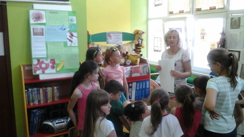 Po filmie, zaprosiliśmy dzieci na warsztaty ekologiczne, które poprowadziła pani Roma Szczerbień. Dzieci uczestniczące w zajęciach dowiedziały się, m.in. jak wygląda proces produkcji papieru, jak minimalizować jego zużycie, segregować i przekazywać do recyklingu. Inspiracją do zajęć była Eko-Paka, czyli pudełko z zawartością w postaci materiałów edukacyjnych oraz artykułów plastycznych, które biblioteka otrzymała w ramach programu „EkoPaka – zamykamy obieg surowców”.