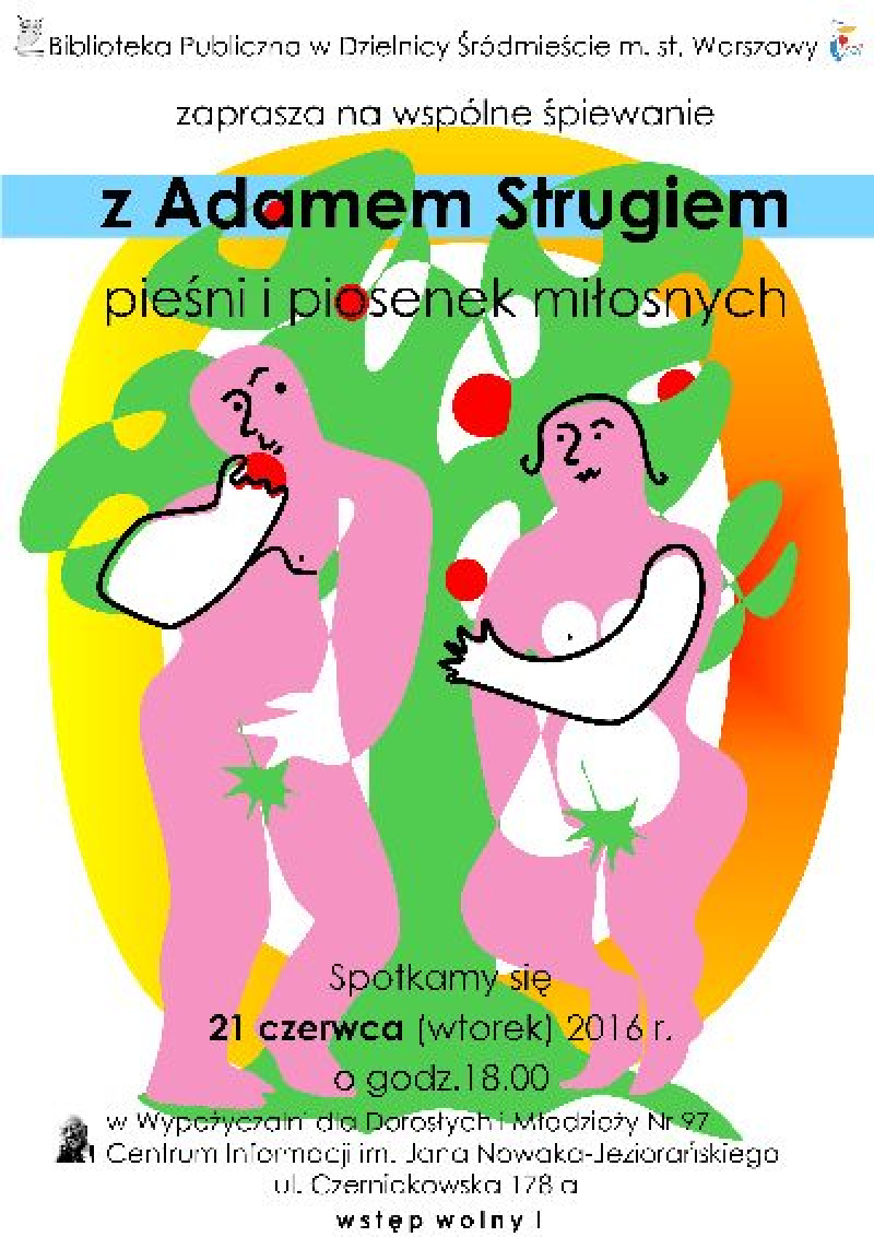 zaprasza na ostatnie w tym roku akademickim prowadzone przez Adama Struga spotkanie śpiewacze które odbędzie się za we wtorek 21 czerwca o 18.00 w Centrum Informacji im. Jana Nowaka-Jeziorańskiego przy ulicy Czerniakowskiej 178A. Wstęp wolny,