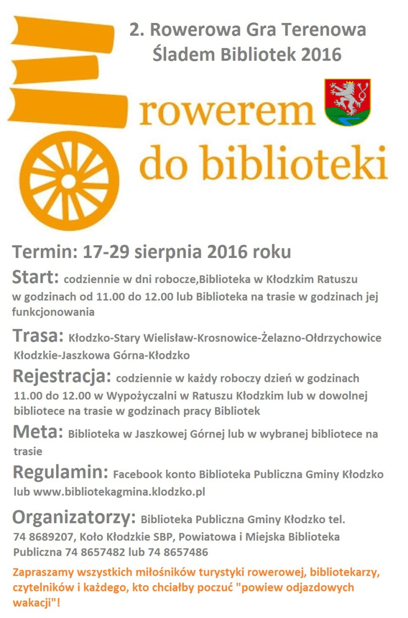 Powiatowa i Miejska Biblioteka Publiczna w Kłodzku zapraszają do udziału w drugiej edycji Rowerowej Gry Terenowej Śladem Bibliotek, która będzie aktywna w dniach 17-29 sierpnia 2016 roku.