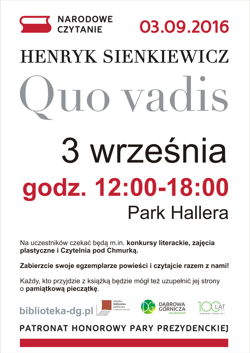 Miejska Biblioteka Publiczna w Dąbrowie Górniczej już po raz piąty weźmie udział w ogólnopolskiej akcji czytelniczej zainicjowanej w 2012 r. przez Prezydenta RP. Tym razem, w 2016 r., wspólnie będziemy czytać „Quo vadis” Henryka Sienkiewicza.