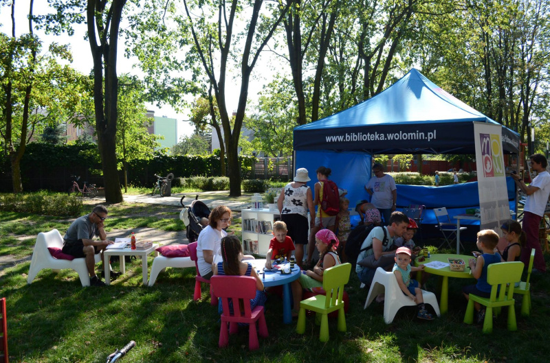 W tym roku już po raz czwarty zawitaliśmy na skwer im. Bohdana Wodiczki z letnią akcją „Biblioteka pod chmurką”. W sierpniowe soboty na wszystkich odwiedzających nasze stoisko, czekali wołomińscy bibliotekarze z porcją dobrej literatury, animacjami oraz mnóstwem pozytywnej energii w pakiecie. Podczas finału naszych wakacyjnych spotkań pod Chmurką, spotkała się natura z nowoczesnością. Wołomiński skwer opanowały pszczoły i roboty-Finche. Pasjonat pszczelarstwa Artur Koc, opowiadał o fascynującym świecie pszczół. Można było przymierzyć strój w jakim pracuje bartnik, zobaczyć jak wygląda wnętrze ula oraz dotknąć akcesoria, niezbędne do pracy przy tych pożytecznych owadach. Z kolei małe Finche przysporzyły dużym i małym sporo emocji przy pokonywaniu wirtualnego labiryntu. Taki labirynt można było stworzyć samemu i przez chwilę poczuć się jak programista.