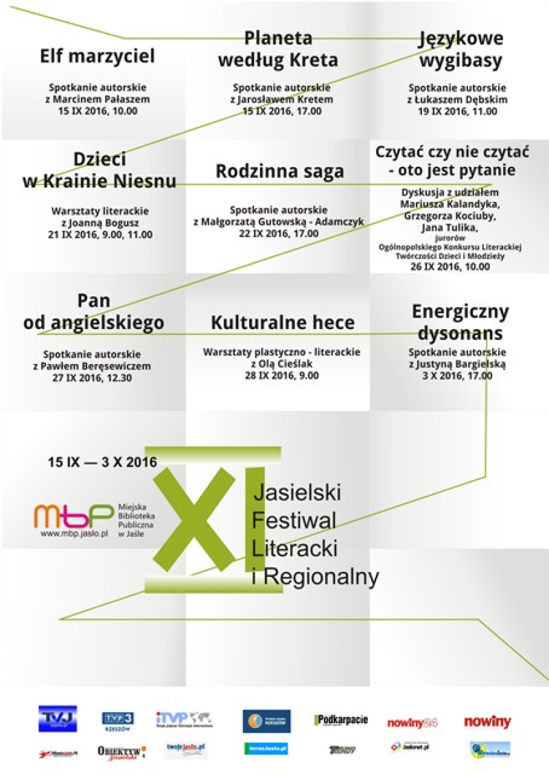 Od 15 września do 3 października br. Miejska Biblioteka Publiczna w Jaśle zaprasza do udziału w XI Jasielskim Festiwalu Literackim i Regionalnym. Przed nami kolejna odsłona niepowtarzalnych spotykań z udziałem współczesnych twórców literatury polskiej oraz osób związanych z naszym regionem. Nie może Cię zabraknąć!