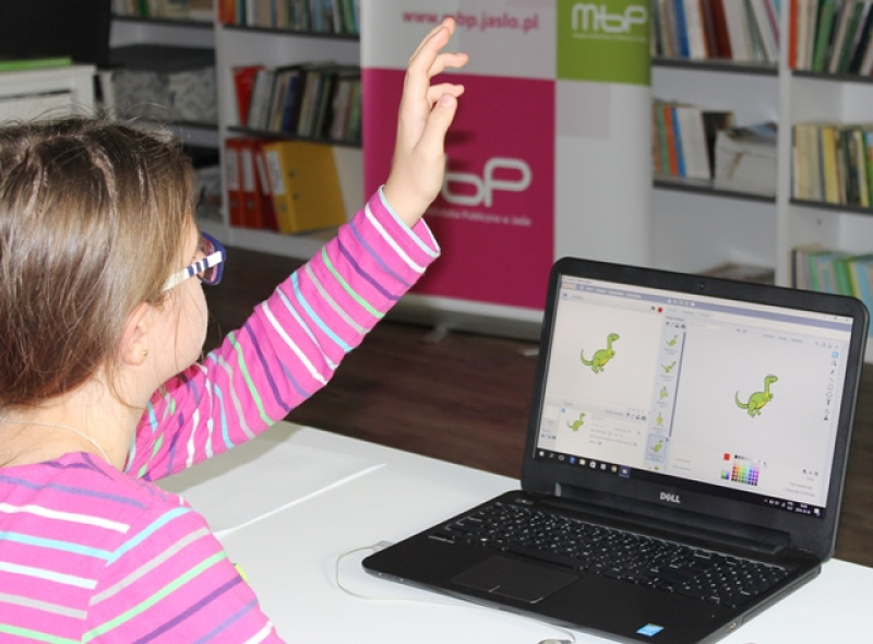 Starsi adepci programowania w wieku 9-12 lat podczas dwóch spotkań zapoznali się z programem Scratch. Odkryli znaczenie grup poleceń oznaczonych różnymi kolorami i odpowiadającymi za różne działania np. ruch, dźwięk czy wygląd. Nauczyli się dodawać duszki, poruszać postaciami w różnych kierunkach i zmieniać tło. Stworzyli tańczącego dinozaura, animowali swoje imię i przeprowadzili wybrane zwierzątko przez labirynt. Szkoda, że to tak krótko trwało. Chciałbym częściej kodować – powiedział Piotrek na zakończenie zajęć.