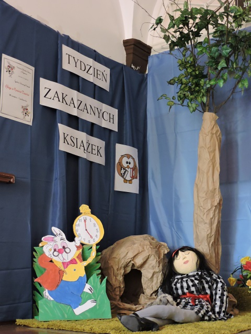W 1931 w chińskiej prowincji Hunan zakazano czytania „Alicji w Krainie Czarów” Lewisa Carrolla. To właśnie ten tytuł stał się myślą przewodnią tegorocznej wystawy Tygodnia Zakazanych Książek w Powiatowej Bibliotece Publicznej w Wągrowcu. Wystawę można było zwiedzać od 26 września do 7 października 2016 r. Każdego dnia gościliśmy po kilka grup szkolnych i przedszkolnych oraz młodzież z ZSP nr 2 w Wągrowcu. Wystawę odwiedzili również seniorzy z zaprzyjaźnionego Dziennego Domu Seniora. Łącznie wystawę odwiedziło około 650 osób.
