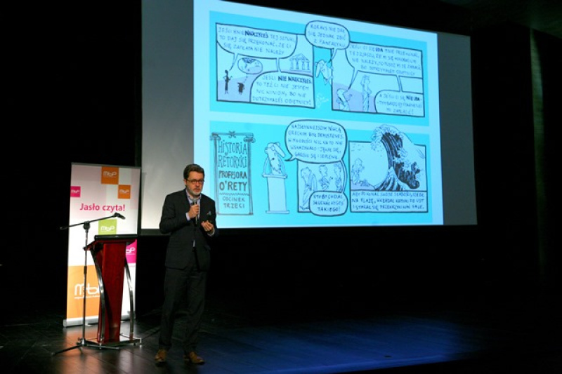 O tym, jak na jasielski dworzec wtoczył się brzuchaty parowóz buchając parą spod kół, i komu żądni wrażeń jaślanie tłumnie oddawali hołd – przekonali się uczestnicy IV Dyktanda Regionalnego „Jasielszczyzna zna polszczyznę”, zorganizowanego przez Miejską Bibliotekę Publiczną w Jaśle – 4 listopada 2016 r. w ramach projektu "Polski-Pomysłowy". Gościem specjalnym wydarzenia był Michał Rusinek – wykładowca na Wydziale Polonistyki UJ, tłumacz, autor książek dla dzieci i dorosłych, prezes Fundacji Wisławy Szymborskiej.