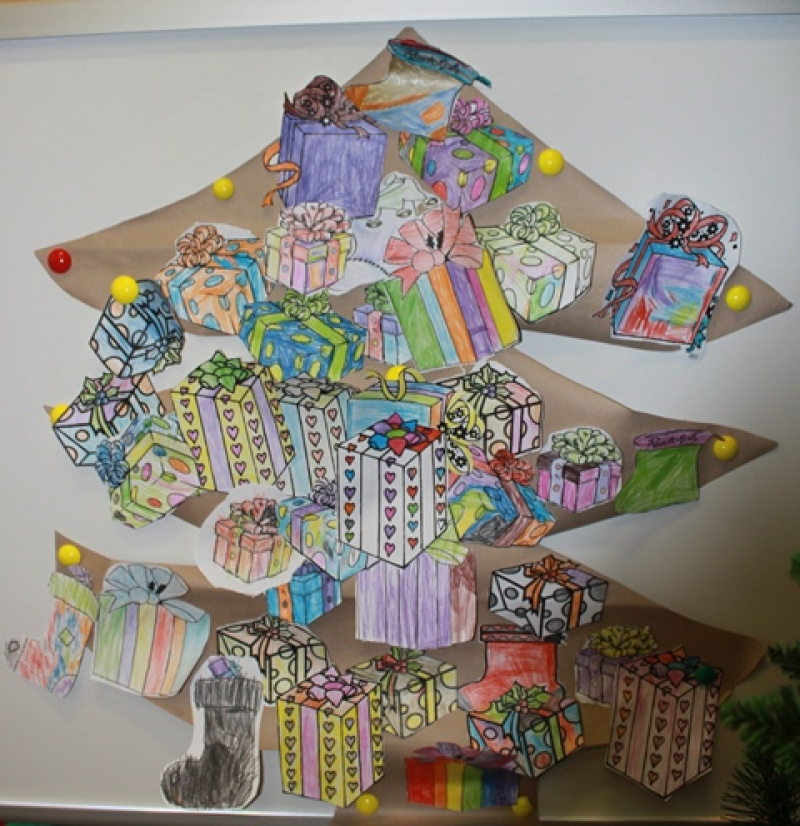 Dzieci wzięły udział w zabawach, podczas których miały okazję wykazać się swoimi wiadomościami i umiejętnościami. Świetnie bawiły się przy łapaniu pompona do czapki Mikołaja. Odpowiadały na zagadki dotyczące Świętego Mikołaja i przynoszonych przez niego prezentów. Następnie pięknie pokolorowały obrazki z prezentami, którymi ozdobiły choinkę.