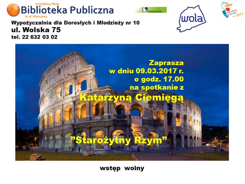 9 marca 2017 r. o godz. 17.00 zapraszamy do Wypożyczalni dla Dorosłych i Młodzieży nr 10 przy ul. Wolskiej 75 na spotkanie z Katarzyną Ciemięgą, podróżniczką z zamiłowania, która opowie o bogactwie i urokach starożytnego Rzymu. Wspaniałe zabytki, harmonia kolorów od czerwieni poprzez ochrę i szarość marmurów, to wszystko fascynuje tych, którzy już od wieków jeżdżą do wiecznego miasta. Forum Romanum, Panteon, Koloseum to tylko niektóre z licznych zabytków Rzymu, o których usłyszymy od naszej Prelegentki.