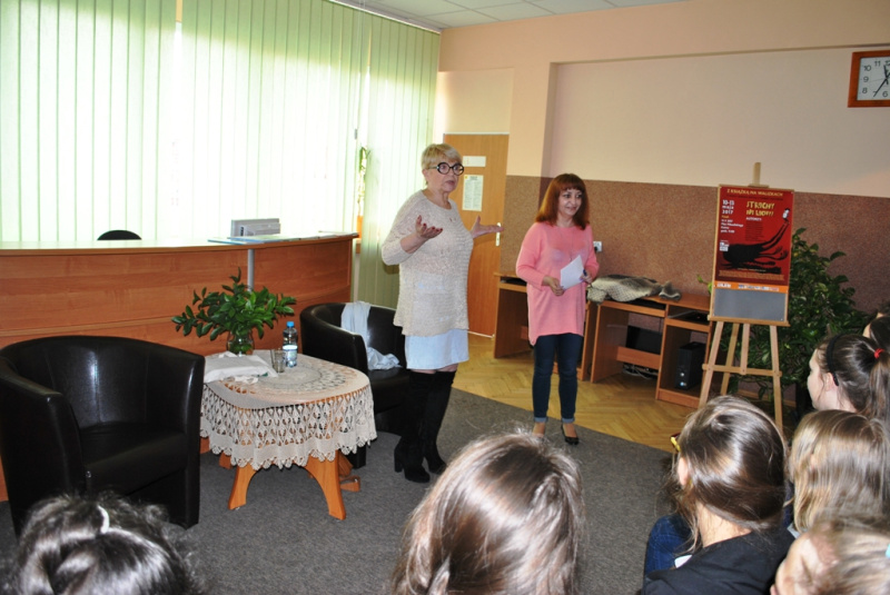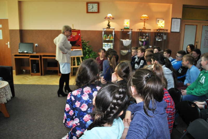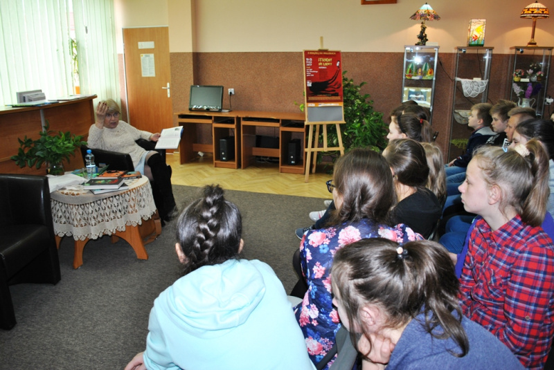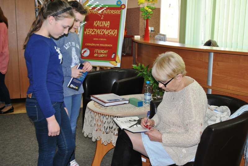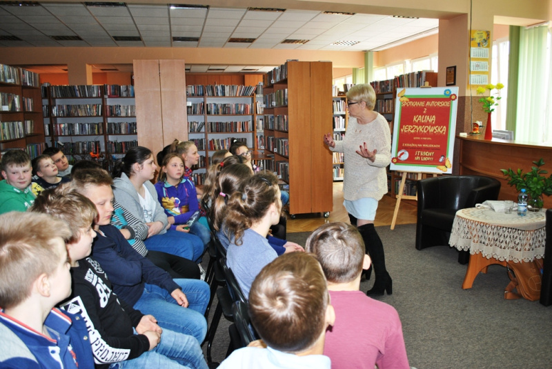 Kalina Jerzykowska jest polonistką, dziennikarką, autorką wierszy, powieści, piosenek oraz sztuk i scenariuszy teatralnych dla dzieci. Za swoją pracę pani Kalina została uhonorowana tytułem Kawalera Orderu Uśmiechu. Na spotkaniu Kalina Jerzykowska opowiadała o swoich książkach oraz czytała ich fragmenty, opowiadała też anegdoty ze swojego życia prywatnego. Uczniowie słuchali z wielkim zainteresowaniem i zadawali wiele pytań. Po spotkaniu uczestnicy mogli zakupić książki autorki i otrzymać autograf.