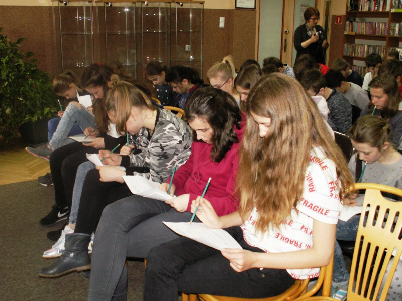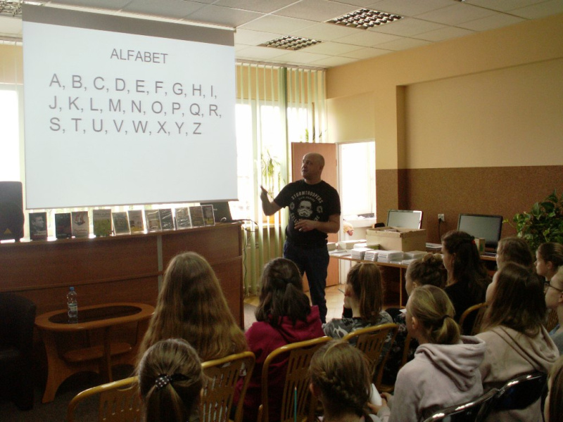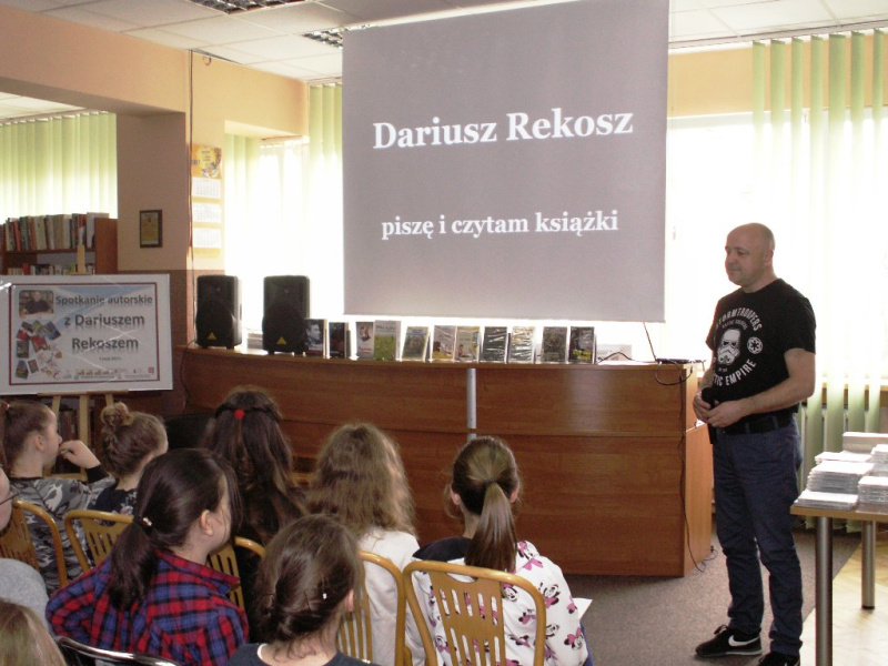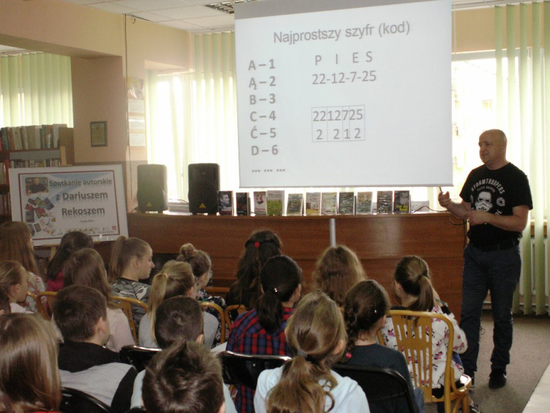 Spotkanie miało bardzo ciekawą formę - były to warsztaty detektywistyczne, podczas których prowadzący wprowadził młodych ludzi w sprawy języka i alfabetu, pokazał w jaki sposób można je wykorzystać. Przedstawił również sposoby zaszyfrowania wiadomości. W części praktycznej uczniowie próbowali rozkodować zapisy autora a najszybsi otrzymali nagrody książkowe. Oprócz zajęć praktycznych Pan Dariusz Rekosz przygotował również krótką prezentację o swojej literackiej działalności i przedstawił ciekawych ludzi, których miał przyjemność spotkać na swej pisarskiej drodze. Miłośnicy jego twórczości mieli też okazję nabyć książki autora z autografem i dedykacją.