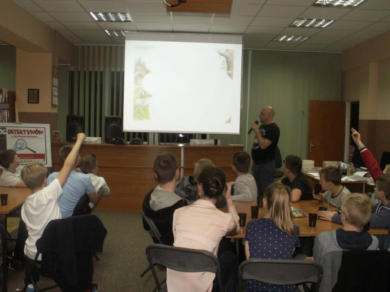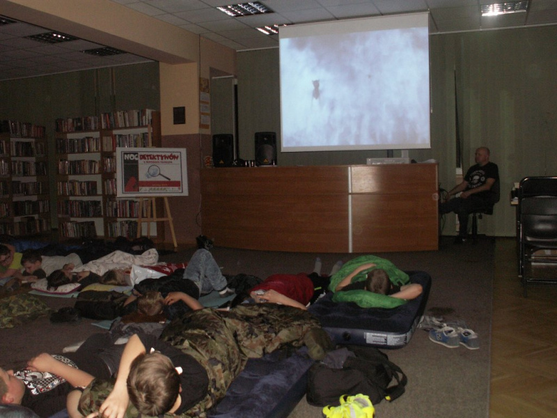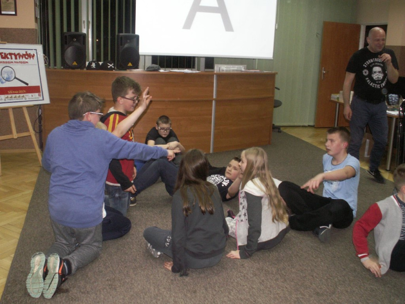 Po krótkiej prezentacji swojej twórczości i pracy zawodowej autor rozpoczął część detektywistyczną. Uczestnicy nie mieli czasu na nudę, czekało na nich bowiem wiele ciekawych zadań i tajemniczych zagadek do rozwikłania. Na początku każdy z młodych detektywów przybrał nowy pseudonim, którym posługiwał się przez całe spotkanie. Następnie wszyscy uczestnicy zostali podzieleni na dwie rywalizujące ze sobą grupy. Po zapoznaniu się z podstawowymi sposobami szyfrowania i odszyfrowywania wiadomości przyszedł czas na pierwsze zadanie - każda grupa stworzyła dla siebie nawzajem krzyżówkę. Druga rozgrywka polegała na utworzeniu historii kryminalnych poprzez uzupełnienie wymyślonymi dialogami fragmentu komiksu z pustymi dymkami. Dużą frajdę sprawiło dzieciom kolejne zadanie - odgadywanie tytułów książek na podstawie wyświetlanych fragmentów ilustracji. W następnych zadaniach młodzi detektywi musieli wykazać się również talentem plastycznym tworząc portret pamięciowy ze słuchu oraz portret pamięciowy ze wzroku. Najtrudniejszym zadaniem, jakie zostało postawione przed uczestnikami było rozwiązanie „Wielkiej zagadki”. Po tej konkurencji przyszedł czas ostatnie już zadanie, które dostarczyło dzieciom wiele emocji i wrażeń – ułożenie w jak najkrótszym czasie ze swoich ciał kształtu liter. Drugą część spotkania stanowił nocny maraton filmowy. Sen zszedł na dalszy plan… Nasi detektywi wcale nie byli zmęczeni, a niektórzy z uczestników nie zmrużyli tej nocy oka.