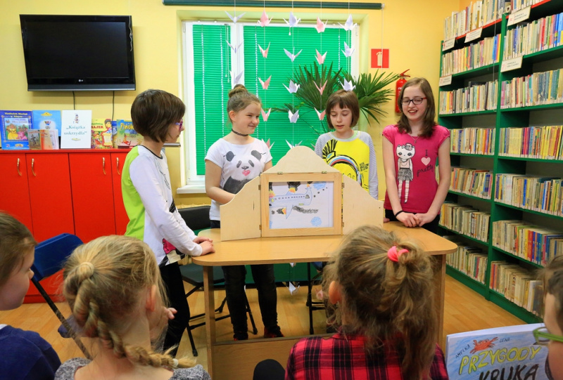 9 maja Biblioteka stała się sceną międzypokoleniową, gdyż tego dnia w warsztatach wzięli udział uczniowie Zespołu Szkół nr 2 w Niegowonicach, Szkoły Podstawowej w Wysokiej oraz przedstawicielki Dyskusyjnego Klubu Książki. Pojawienie się osób dorosłych spowodowało szczególną mobilizację wśród grup dziecięcych, a zderzenie dziecięcej wyobraźni i dojrzałych myśli oraz talentów plastycznych ze wskazówkami pani Zosi zaowocowało niebanalnymi opowieściami ujętymi w drewniane teatralne ramy.