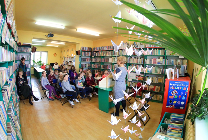 8 maja 2017 r. na japoński szlak opowieści wyruszyły grupy warsztatowe z Zespołu Szkół nr 1 w Łazach, Szkoły Podstawowej nr 3 w Łazach i Niepublicznej Szkoły Podstawowej w Ciągowicach. Prowadząca Zofia Piątkowska – Wolska zabrała najmłodszych w nieznany im świat zaklęty w niewielkiej drewnianej skrzynce, opowiadając pokrótce o historii Kamishibai i wskazując sposób na otwarcie papierowego teatru, tak by salę warsztatową wypełniło magiczne „Sezamie otwórz się!”. Dzieci wzięły także udział w seansie głośnego czytania, a następnie wraz z prowadzącą opowiadały bajkę przy pomocy skrzynki Kamishibai, jednak była to tylko delikatna rozgrzewka przed zasadniczą częścią warsztatów. Pani Zosia z niebywałym entuzjazmem przybliżała w niej sposób tworzenia własnych unikalnych historii na kartach ilustracyjnych. Każda grupa używała „story cubes” – kostek z piktogramami, aby poznać słowa-klucze w swojej opowieści i przejść do działania pełnego pasji i zaangażowania. Po przygotowaniu ilustracji oraz tekstów stawała na małej teatralnej „scenie” i próbowała swych sił w wyjątkowych opowieściach nagradzanych gromkimi brawami.