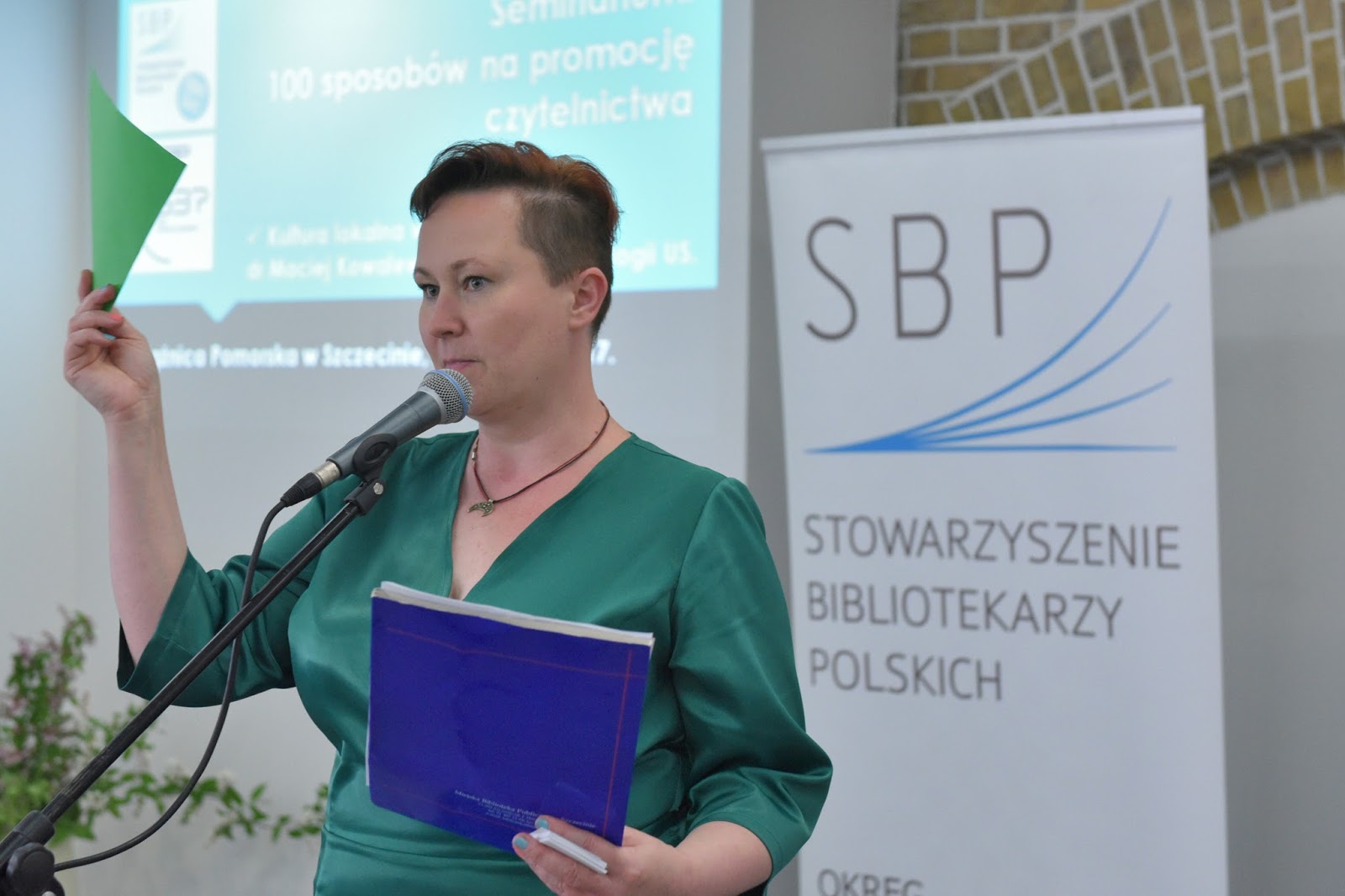 Marta Kostecka - Przewodnicząca Oddziału Szczecińskiego SBP i koordynatorka zachodniopomorskiej akcji “Poczekalnia-poczytalnia. Czekając, czytajmy” ogłosiła wyniki dotychczasowych zgłoszeń uczestników akcji (50 punktów w miejscowościach: Postomino, Jarosławiec, Sławno, Koszalin, Białogard, Myślibórz, Tychowo, Choszczno, Szczecin, Stargard, Police, Chojna, Nowogard, Kamień Pomorski, Gryfino, Barlinek), zapowiedziała wsparcie finansowe dla lokalnych organizatorów akcji i zaprosiła koła OZ SBP/biblioteki do współuczestnictwa (akcja trwa przez cały 2017 rok).