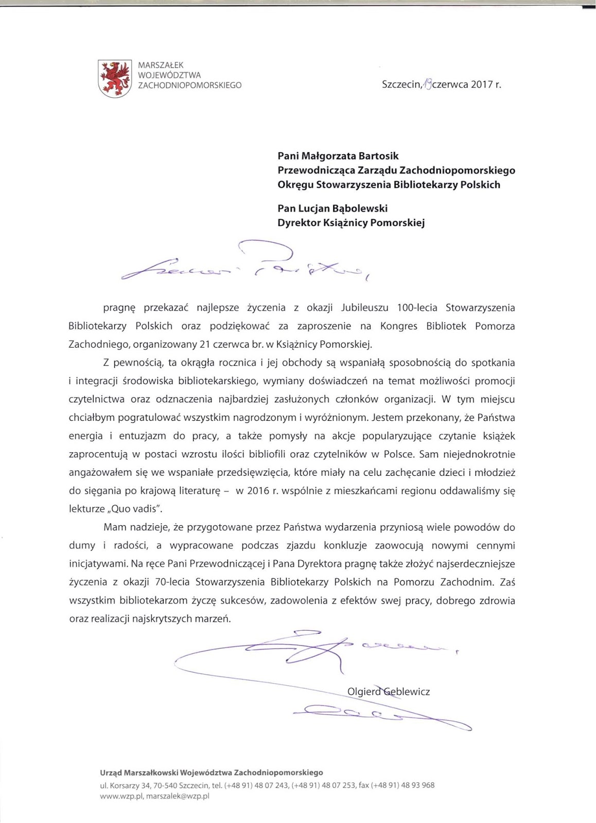 Po uroczystych powitaniach zaproszonych gości przez gospodarza miejsca Lucjana Bąbolewskiego - Dyr. Książnicy Pomorskiej w Szczecinie, członka Koła 1 OS SBP oraz podziękowaniach Małgorzaty Bartosik - Przewodniczącej Zarządu Okręgu Zachodniopomorskiego SBP - dla członków zrzeszonych zarówno za dotychczasowe trwanie, jak i owocną działalność w strukturach Stowarzyszenia, głos zabrał Bartłomiej Mroczkowski - Dyrektor Wydziału Kultury, Nauki i Dziedzictwa Narodowego Urzędu Marszałkowskiego, który odczytał list od Marszałka – Olgierda Geblewicza - skierowany do zachodniopomorskich bibliotekarzy.