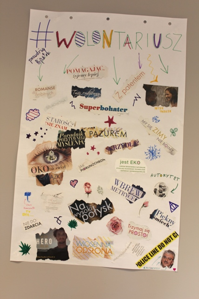 Już do pierwszego zadania wolontariusze podeszli z dużym zapałem i sporą dawką kreatywności. Za pomocą techniki kolażu stworzyli postać dobrego wolontariusza. Wspólnie zastanawiali się nad tym jakie cechy powinien posiadać taki wolontariusz oraz w jaki sposób może je nabywać i doskonalić.