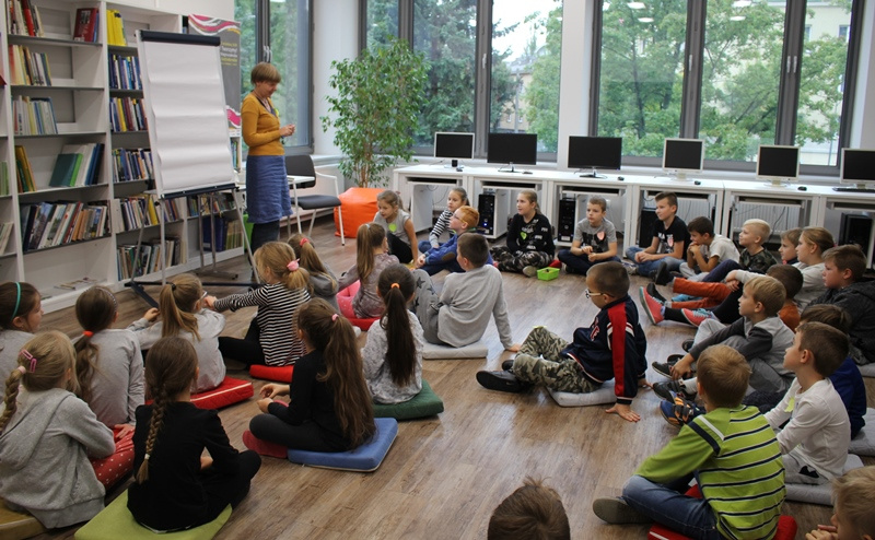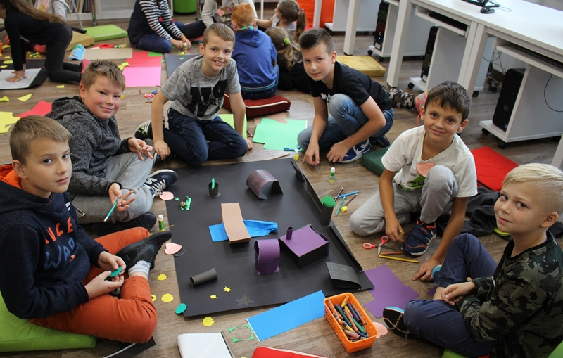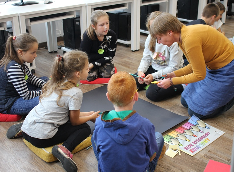 Jola Richter-Magnuszewska, czytając wiersze Danuty Wawiłow m.in. O rupakach, Jak tu ciemno!, Wieczór, wprowadziła uczestników warsztatów w magiczny nastrój nocy. Ilustratorka przekonała nas, że wbrew pozorom noc ma wiele barw i wcale nie jest czarna! Może być mroczna i pełna niezidentyfikowanych, przerażających dźwięków, albo wygodna, miękka i ciepła jak norka, w której można się ukryć. Może sprzyjać pojawianiu się przyjaznych i niezwykłych stworzeń, takich jak rupaki czy zwykłe jelonki. Młodzi ilustratorzy zainspirowani przeczytanymi tekstami i opowieściami artystki o tym, jak powstają ilustracje, stworzyli – najpierw w wyobraźni – obraz miasta nocą, a potem pracując w kilkuosobowych grupach przenieśli swoje wizje na karton. Powstały wspaniałe ilustracje i trójwymiarowe makiety.