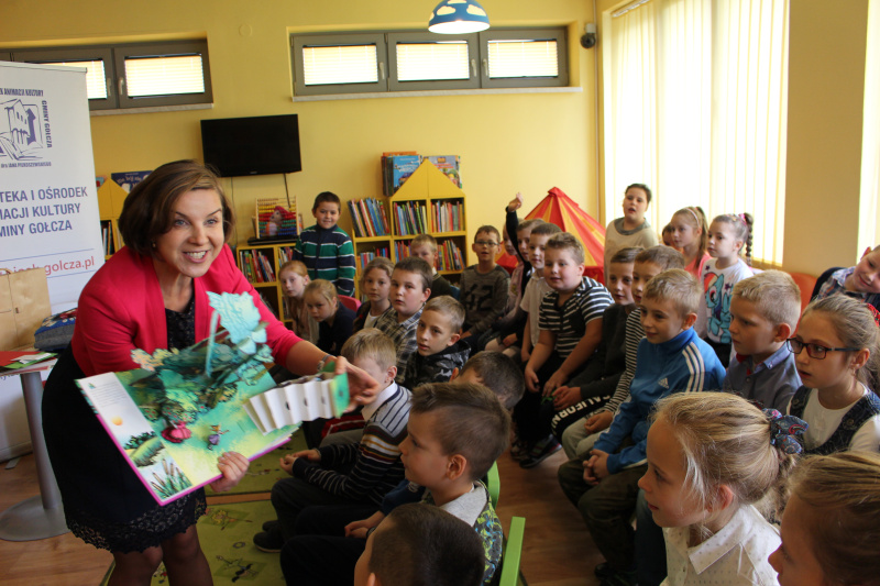 Pani Wandą Matras-Mastalerz, która prowadziła zajęcia przywiozła ze sobą książeczki z różnych stron świata. Mieliśmy więc francuską „książkę z dziurą”; bogato ilustrowaną, przestrzenna książkę z USA, japońską książkę- teatrzyk „kamshibai” oraz książkę manualną autorstwa pani Wandy. Drugoklasiści ze szkoły podstawowej w Gołczy, którzy uczestniczyli w spotkaniu z zapartym tchem słuchali bajek opowiadanych prze panią Wandę z użyciem tych nietypowych książek. Największy entuzjazm wzbudziła książka francuska Herve Tulleta.