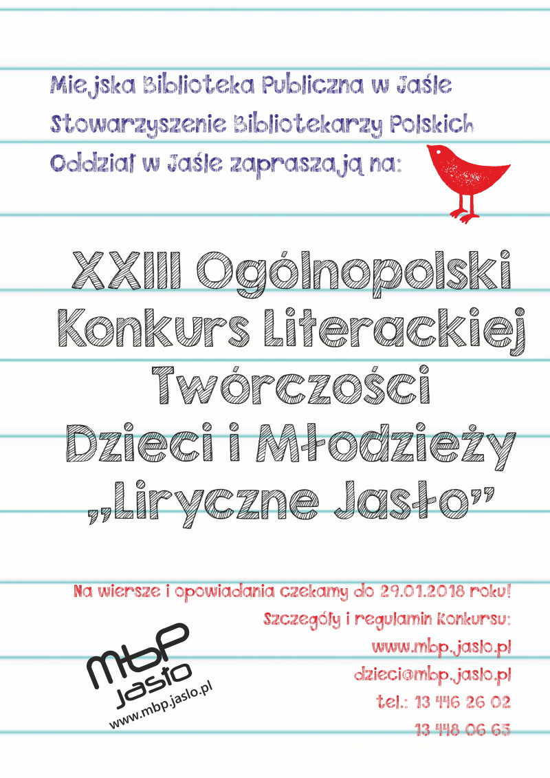 Piszesz opowiadania lub wiersze? Weź udział w XXIII Ogólnopolskim Konkursie Literackiej Twórczości Dzieci i Młodzieży „Liryczne Jasło”. Na prace czekamy do 29 stycznia 2018 r.