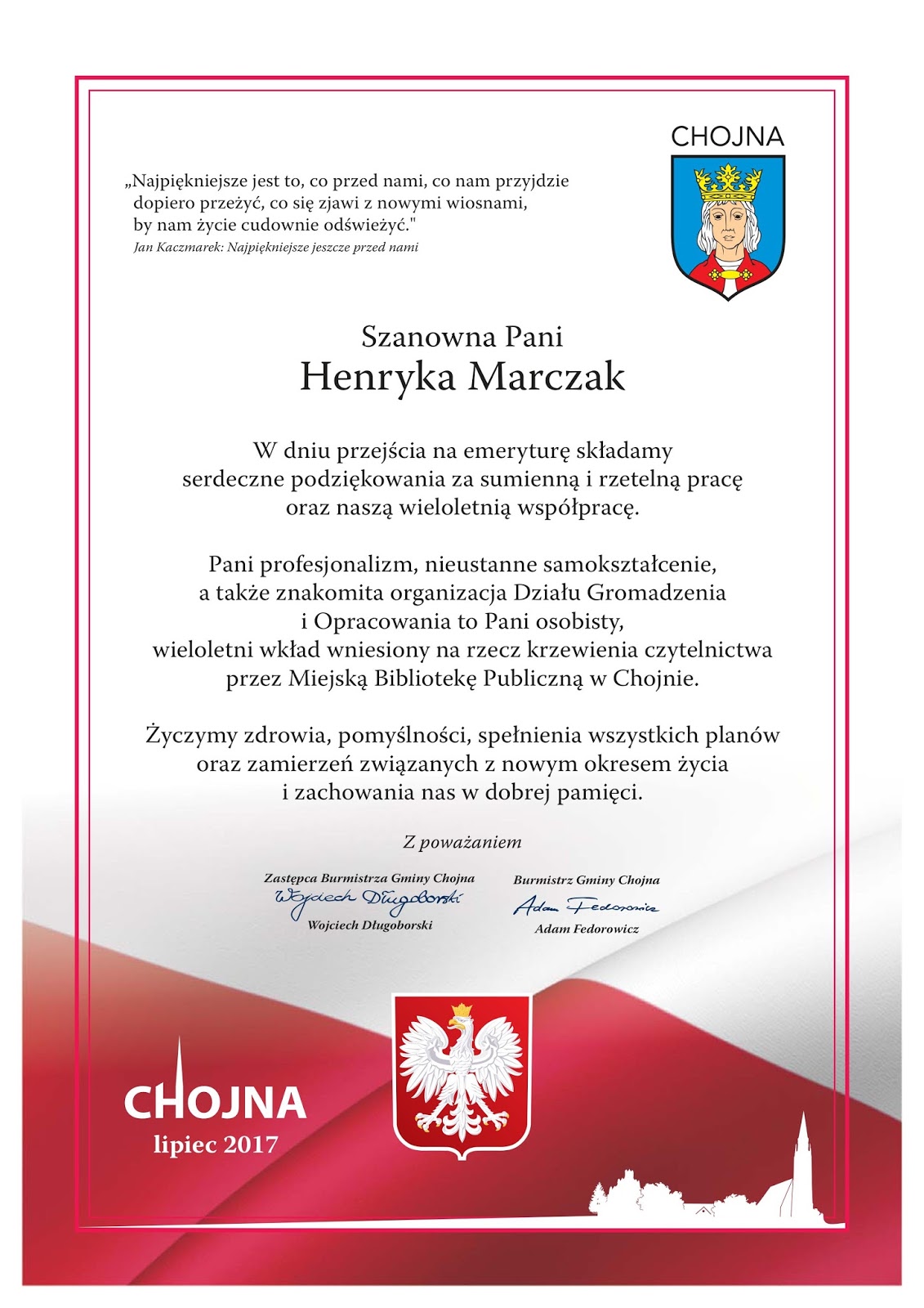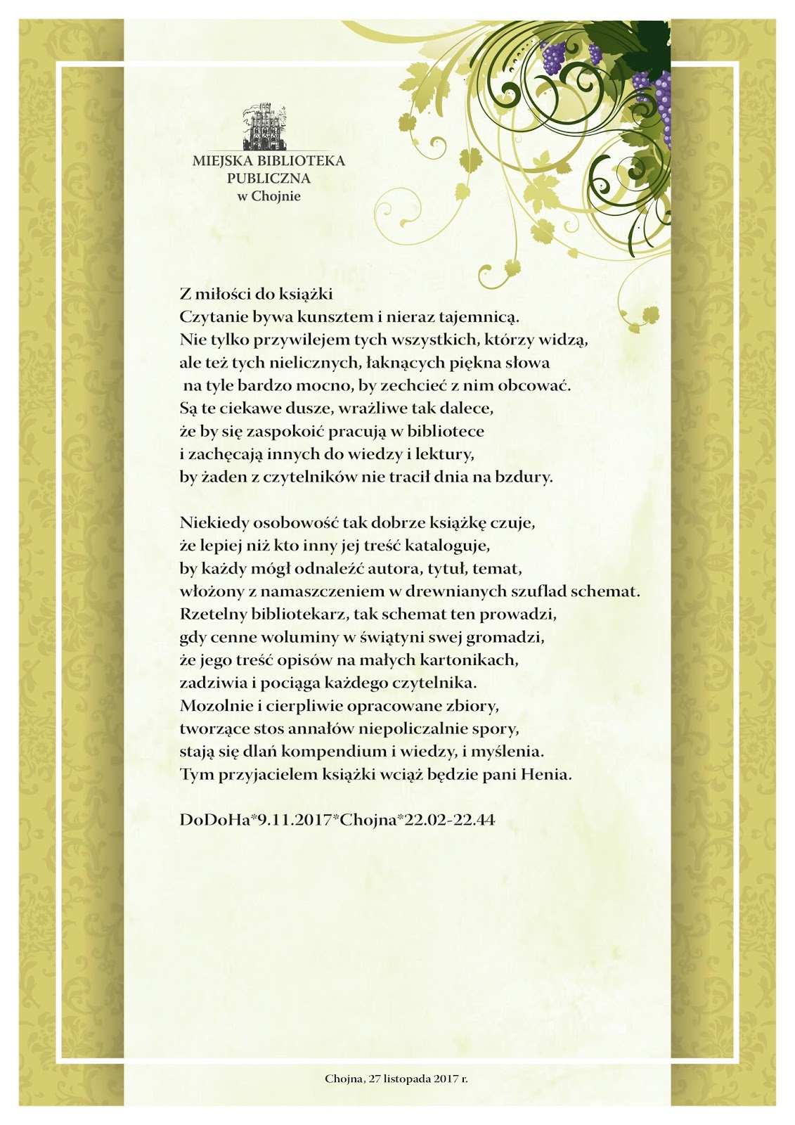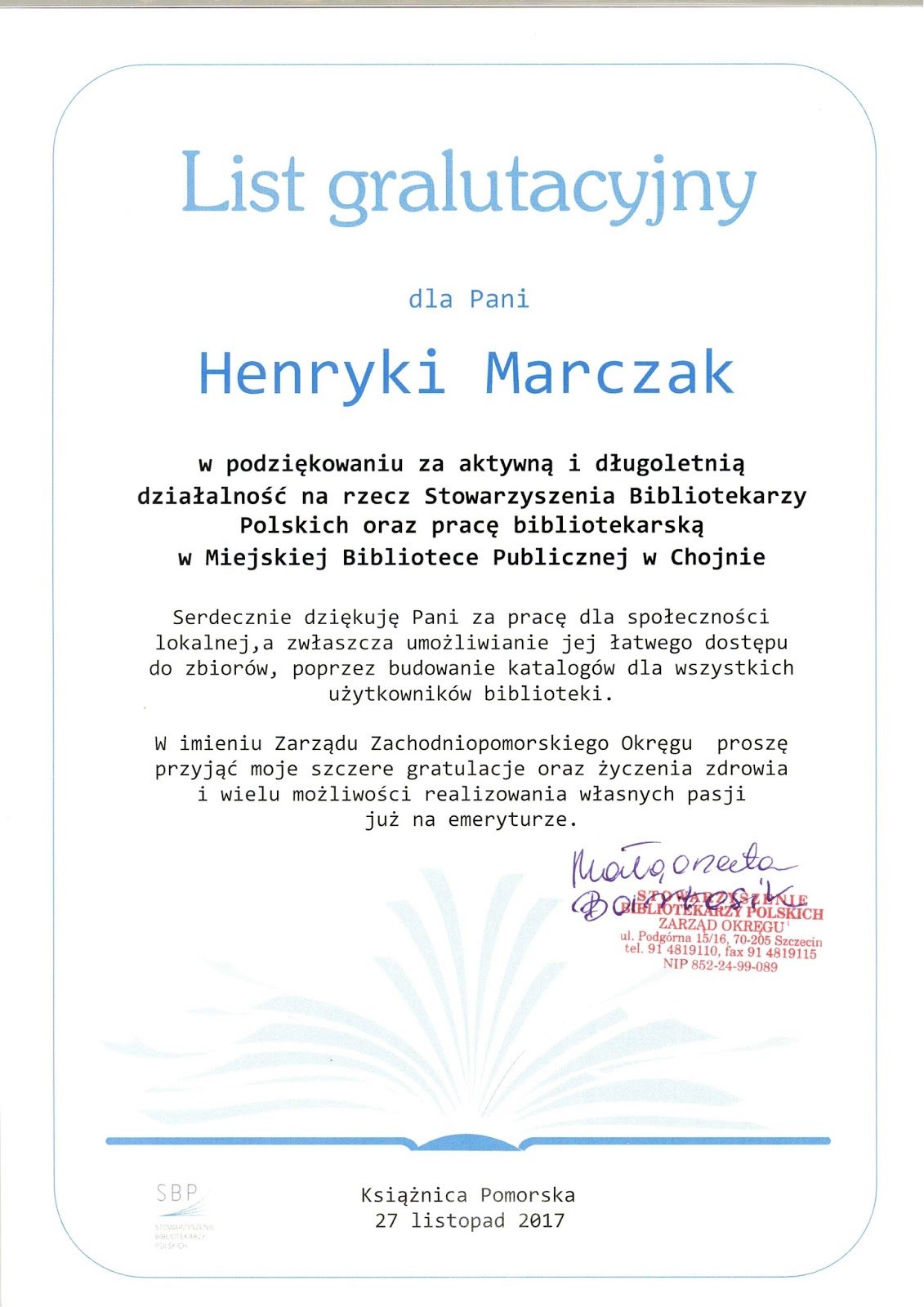 27 listopada 2017 roku Miejska Biblioteka Publiczna w Chojnie stała się przestrzenią sympatycznej uroczystości. Po 36 latach z czynnego życia zawodowego na emeryturę przeszła wieloletnia chojeńska bibliotekarka i członkini Koła 4 OS SBP pani Henryka Marczak.