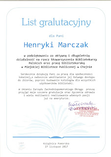 27 listopada 2017 roku Miejska Biblioteka Publiczna w Chojnie stała się przestrzenią sympatycznej uroczystości. Po 36 latach z czynnego życia zawodowego na emeryturę przeszła wieloletnia chojeńska bibliotekarka i członkini Koła 4 OS SBP pani Henryka Marczak.