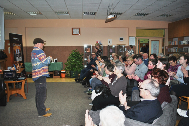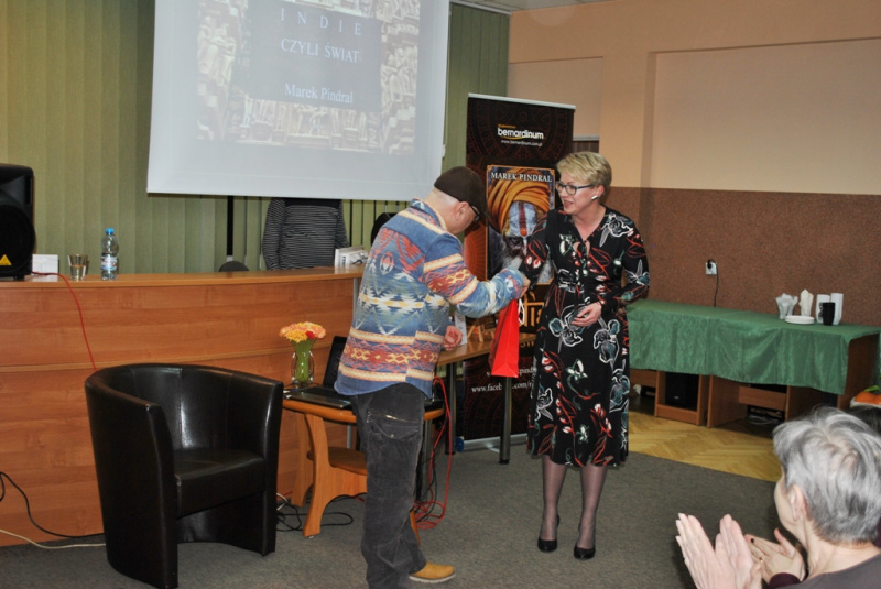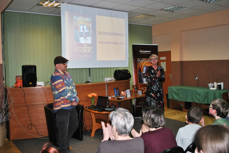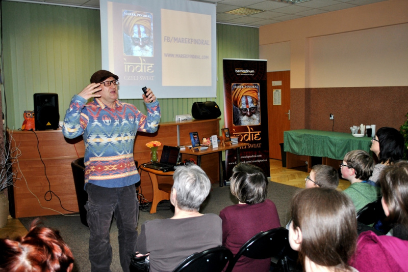 Pan Marek zabrał nas w podróż przez Indie do miejsc i ludzi, których sam poznał. Barwny język, jakim przekazywał swoją opowieść, sprawił, że w wyobraźnia przeniosła do opisywanego przez niego kraju. Na spotkaniu opowiedział min. o wizycie w Bibliotece Liści Palmowych, gdzie spisane są losy ludzkości, przeszłe ale i przyszłe, o prywatnej audiencji , na której przyjął go Sai Baba wcielenie bóstwa, o świątyni, gdzie kamienne posągi splecione są w erotycznym uniesieniu oraz o takiej w której czci się i karmi mieszkające w niej szczury. Opowiadał to z właściwym sobie poczucie humoru, na który żywo reagowali słuchacze.