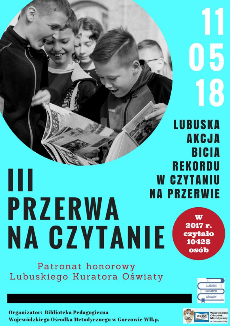 „III Przerwa na czytanie” to nasz pomysł na promocję czytelnictwa, skierowany do wszystkich placówek z województwa lubuskiego. Chcemy pokazać dzieciom, że czytanie jest ciekawe, jak również zachęcić do sięgnięcia po książkę w każdej sytuacji i każdym miejscu. Zgłoszona szkoła/placówka wypełniając formularz jest zobowiązana do przeprowadzenia na terenie całej szkoły akcji czytelniczej bicia rekordu w czytaniu na przerwie, na dwóch lub więcej wybranych przerwach międzylekcyjnych dnia 11 maja 2018 r. Chcemy pobić nasz zeszłoroczny rekord, który wyniósł 10428 osób.