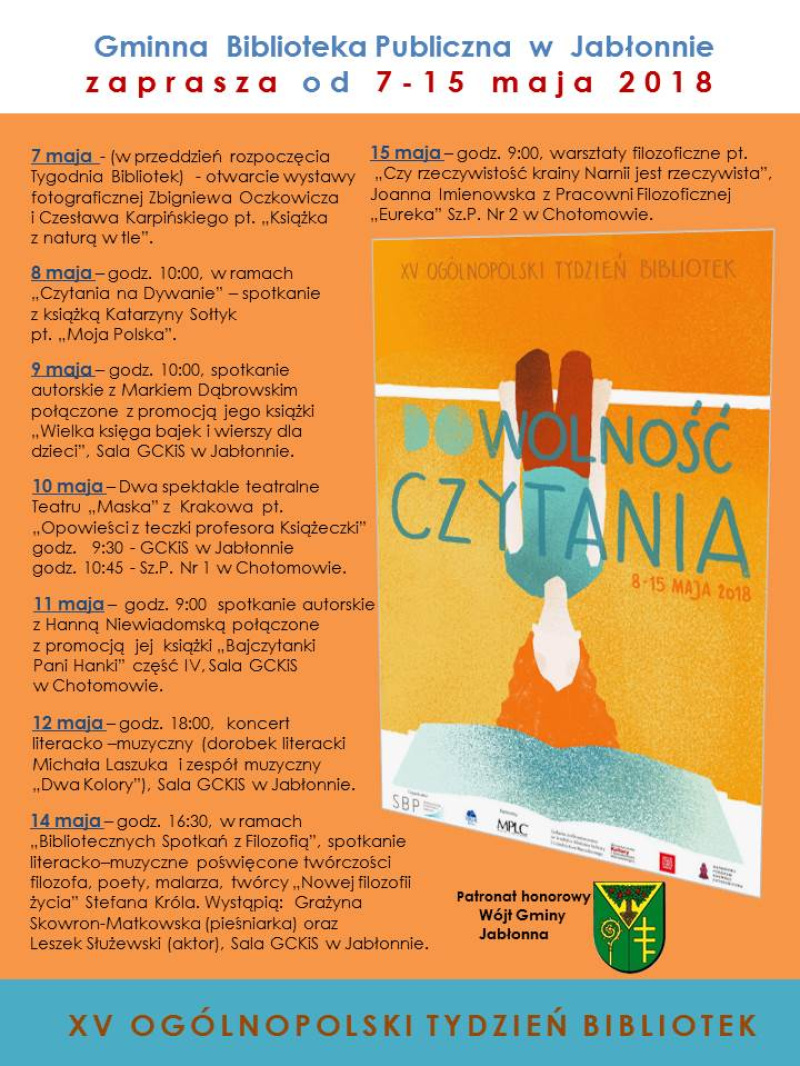 14 maja- Koncert literacko - muzyczny (spotkanie z filozofem i poetą Stefanem Królem). Wystapią: aktor Leszek Służewski i piesniarka Grazyna Skowron Matkowska;
