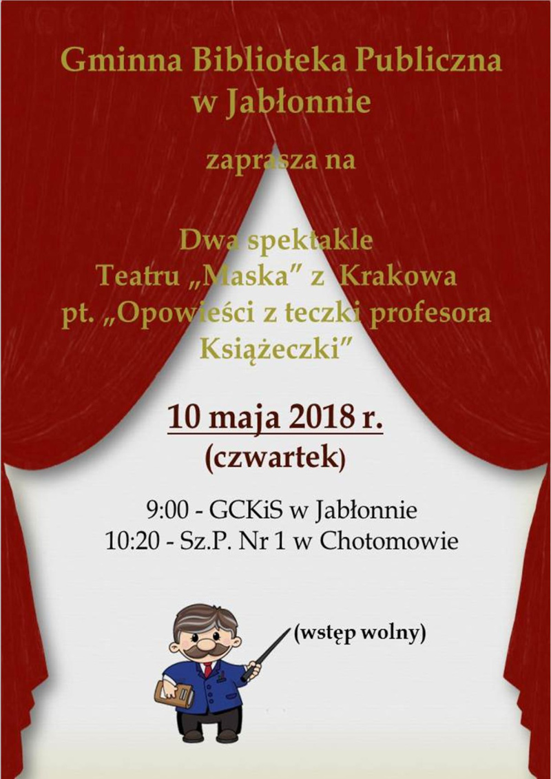 10 maja- Dwa spektakle teatralne pt."Opowieści z teczki profesora Książeczki" w wykonaniu Tearu "Maska" z Krakowa (w Jabłonnie i w Chotomowie);