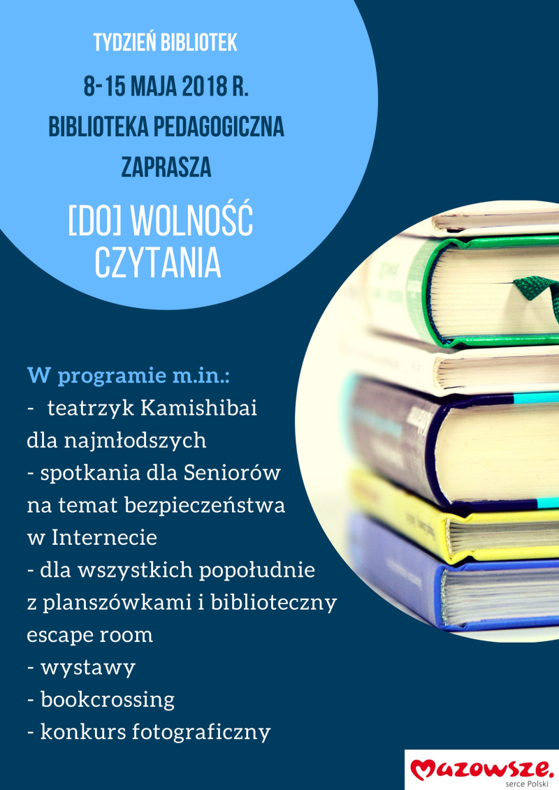 Zaraz po długim weekendzie zapraszamy do wspólnej zabawy podczas Tygodnia Bibliotek od 8 do 15 maja 2018 r. w Bibliotece Pedagogicznej w Radomiu przy ul. Kościuszki 5A. W programie m.in. wycieczka po bibliotece, Escape Room z zagadkami, bookcrossing w plenerze, rodzinne gry planszowe w Czytelni i występ teatrzyku Kamishibai. Będzie też atrakcja dla miłośników płyt winylowych oraz wystawa, na której zobaczycie nasze największe skarby. Zaplanujcie ten czas wspólnie z nami i pamiętajcie: od 8 do 15 maja w bibliotece zapanuje (do)wolność czytania…. . Info i zapisy pod tel. (48)345-95-50 wewn. 110 lub 116 oraz mailowo gromadzenie@bp.radom.pl. Szczegóły na naszej stronie: http://bibliotekapedagogiczna.pl/.