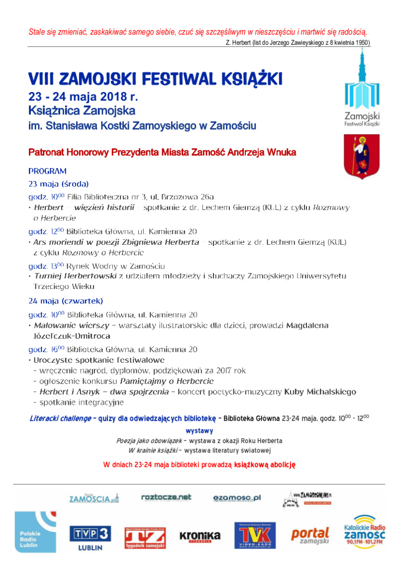 W ramach VIII Zamojskiego Festiwalu Książki zaplanowane zostały m.in. spotkania z cyklu Rozmowy o Herbercie z udziałem dra Lecha Giemzy z KUL, Turniej Herbertowski, podczas którego zinterpretowanych zostanie ponad pięćdziesiąt wierszy i fragmentów jego korespondencji, a także koncert poetycko-muzyczny Kuby Michalskiego. Dla najmłodszych przeprowadzone zostaną warsztaty ilustratorskie oraz quizy i zabawy edukacyjne. Tradycyjnie, podczas uroczystego spotkania, wręczone zostaną karty honorowego czytelnika, wyróżnienia dla osób i instytucji prowadzących efektywne rzecznictwo na rzecz rozwoju biblioteki oraz nagrody dla najaktywniejszych czytelników. Mamy również ofertę dla osób, które zechcą uregulować swoje zobowiązania wynikające z nieterminowego zwrotu wypożyczonych zbiorów. Ogłaszamy dla nich książkową abolicję, która potrwa 23 i 24 maja.