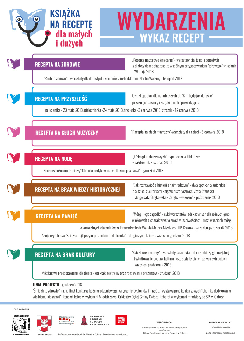 Projekt pod nazwą „Książka na receptę dla małych i dużych” to cykl wydarzeń kulturalnych w Gminie Gołcza związanych z książką realizowanych we współpracy z partnerami: Stowarzyszeniem na Rzecz Rozwoju Gminy Gołcza, Klubem Senior + z Mostku, Szkołą Podstawową im. Jana Pawła II w Gołczy.