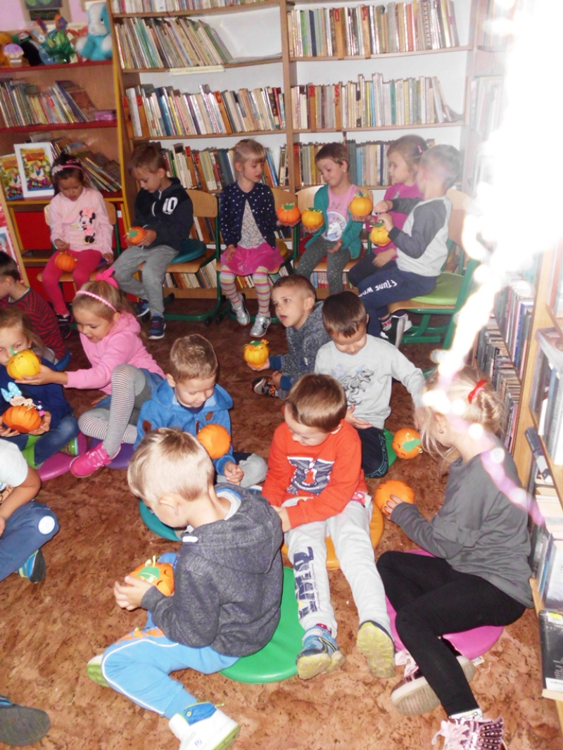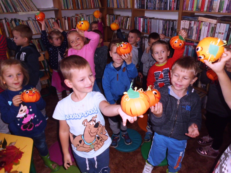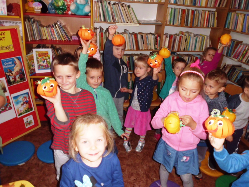 Na zakończenie tej kolorowej wizyty dzieci z radością przyozdabiały zabawne dynie i nadawały im wymyślne imiona. Wracały do przedszkola bardzo zadowolone ze swoimi dyniami, a ich pani z wypożyczoną bajką. I o to chodziło…