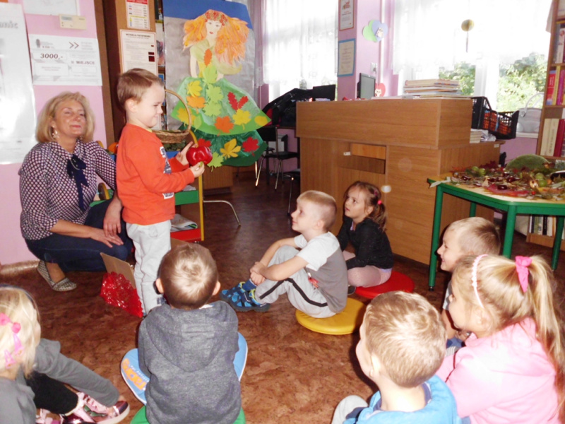 Włosy rozwiane, suknia jakaś poszarpana no i pusty koszyk miała. Okazało się, że to wina jej pomocnika. Psotny wiatr zdmuchnął kolorowe liście, a jej dary wrzucił do pudełka. Dzieci postanowiły pomóc Pani Jesieni.