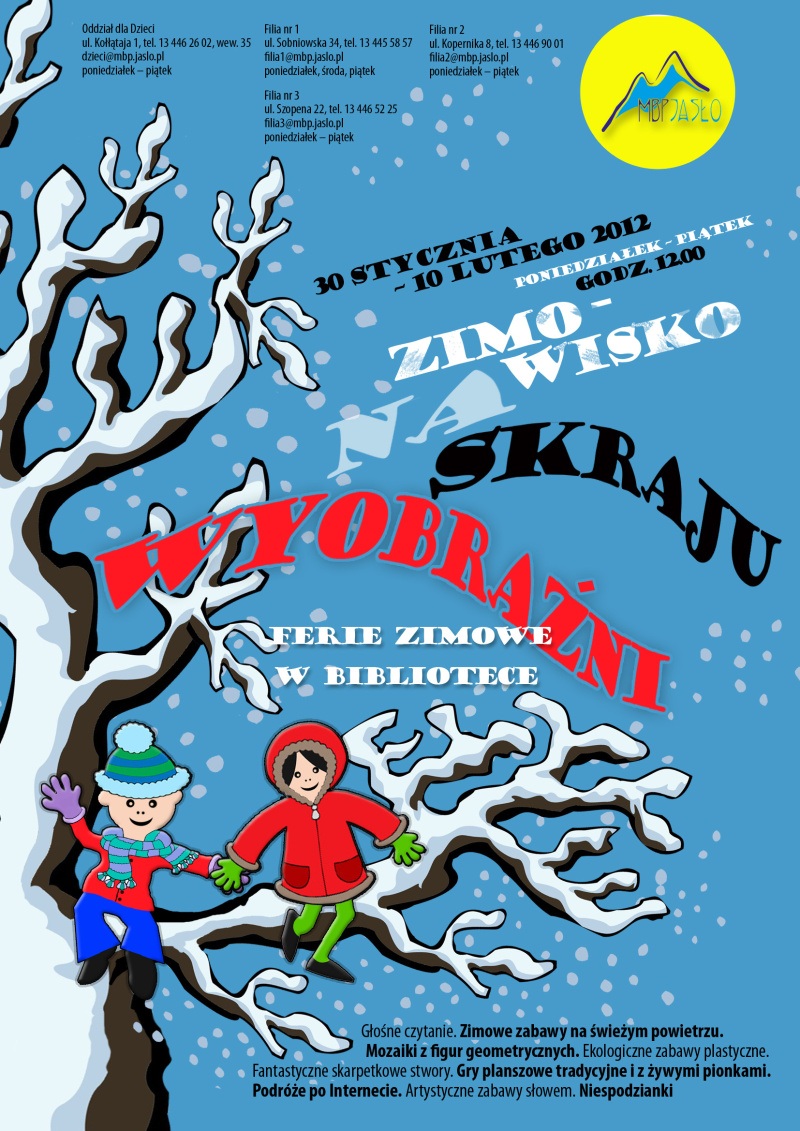 Codzienne spotkania feryjne rozpoczniemy o godzinie 12.00 głośnym czytaniem wierszy Danuty Wawiłow. Zainspirowani jej poetyckimi wizjami, przeniesiemy się w świat zabaw plastycznych: stworzymy mozaikowe obrazki z figur geometrycznych, zimowe krajobrazy z różnych materiałów, a nawet wykonamy tajemnicze Rupaki i kukiełki. Doskonałą rozrywkę a jednocześnie gimnastykę dla szarych komórek zapewnią rebusy, kalambury, krzyżówki i zagadki logiczne. Nie zabraknie też zabaw na świeżym powietrzu. Planowane są wojny na śnieżki oraz konkursy w lepieniu bałwana i innych śnieżnych rzeźb, a gdyby pogoda nie dopisała zabawy zostaną przeniesione do pomieszczeń bibliotecznych, a śnieg zastąpią papierowe kule z makulatury. Oprócz tego, przewidujemy mnóstwo różnorodnych gier i zabaw, jak Żywe rzeźby, Lustro, Co się zmieniło oraz gier planszowych – tradycyjnych i z żywymi pionkami.