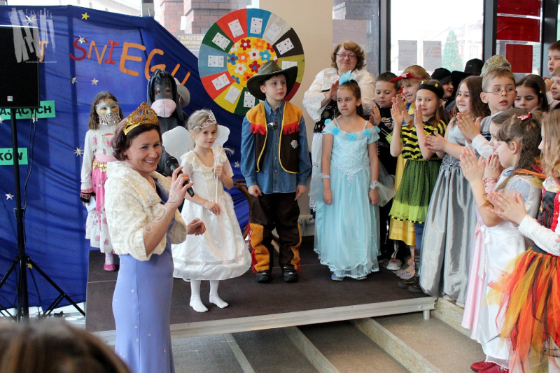 Przybycie tajemniczego gościa - Królowej Śniegu rozpoczęło bal. Swobodny taniec w parach, kółka, kółeczka, wężyk, pociąg, kaczuszki to główne, ale nie jedyne atrakcje przygotowane dla dzieci. Przy muzyce bawili się Indianie, Aniołki, Księżniczki, Czarownice, Cyganki, Człowiek Pająk i wiele innych postaci bajkowych. Wybrano również Królową i Króla balu, którzy w nagrodę za najpiękniejszy strój bajkowy otrzymali książki. Wszystko co dobre ma swój finał. Tak też było w przypadku naszego balu. Nieco zmęczone, ale szczęśliwe dzieci pożegnały Królową z obietnicą spotkania za rok.