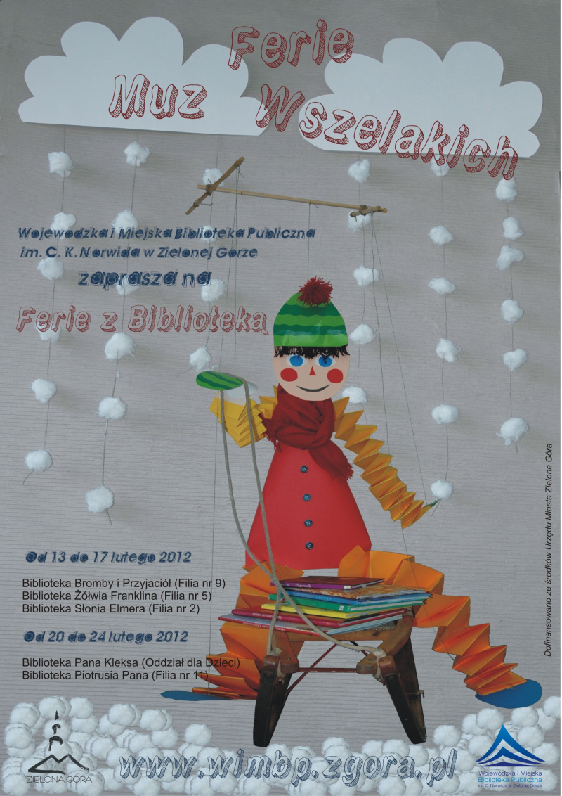 Ruszyły zapisy na „Ferie muz wszelakich”! Ferie w bibliotece odbywać się będą na filiach nr 2, 5, 9, 11 i w Oddziale dla dzieci WiMBP. Zgłoszenia przyjmujemy do niedzieli, 12 lutego. Tel. 68 453 26 10 e-mail oddzial.dzieciecy@wimbp.zgora.pl