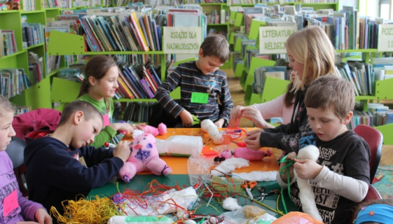 W Oddziale dla Dzieci i trzech filiach bibliotecznych był czas by pofantazjować, a dobra zabawa przyniosła każdemu małemu uczestnikowi mnóstwo uśmiechu i wiele radości. W bibliotece nawet w zimie fruwały ptaki w kolorach tęczy i szybowały fantazyjnie skonstruowane papierowe samoloty. Powstało niejedno Trójkątne Królestwo z zacnym trójkątnym królem, był czas by wspiąć się na Magiczne drzewo zabaw animacyjnych, stać się przez chwilę ufoludkiem w fantazyjnym kapeluszu, a razem z Kubą-Bubą rozwiązywać zagadki, krzyżówki i zimowe rebusy. Dzięki odrobinie fantazji najmłodsi wyczarowali Rupaki z plasteliny i skarpet oraz przenieśli się do papierowej krainy, gdzie nie zabrakło także gier i zabaw słownych. Dzięki zwinności dziecięcych rąk powstały kształtne pejzaże i faliste wyklejanki inspirowane wyobraźnią. Udało się także przenieść na papier Trójkątną Karolinę, stworzyć Feryjną wizytówkę w postaci gniotki-śmieszki i zabawić się w lalkarza, wykonując i wprowadzając w ruch własnoręcznie zrobione kukiełki z kolorowych nici. Była okazja, by stać się w małym projektantem karnawałowych strojów dla bałwanków, stworzyć robota i zagrać w niecodzienną grę z żywymi pionkami. Każdemu feryjnemu spotkaniu towarzyszyło głośne czytanie wierszy Danuty Wawiłow. W Zimowisku na skraju wyobraźni udział wzięło ok. 200 dzieci. Na zakończenie wspólnych spotkań każdy uczestnik otrzymał dyplomik i miłą niespodziankę.
