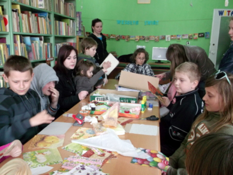 W drugiej części warsztatów odbyły się zajęcia plastyczne, prowadzone przez bibliotekarkę, która opowiadała o dawnych obyczajach i tradycjach świąt Wielkiej Nocy. Na warsztatach plastycznych dzieci poznały różne techniki ozdabiania jajek. Spośród wielu technik zdobniczych pisanek, najchętniej wykorzystywana była technika decoupage.