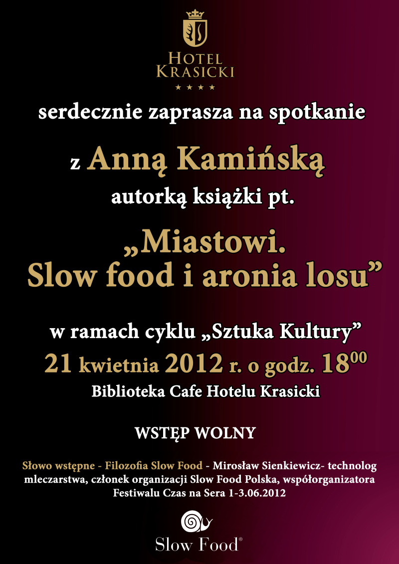 Biblioteka w HOTELU KRASICKI W LIDZBARKU WARMIŃSKIM serdecznie zaprasza na spotkanie autorskie z pisarką Anną Kamińską, autorką książki „Miastowi. Slow food i aronia losu”. Wieczór autorski odbędzie się w sobotę 21 kwietnia 2012 r. o godzinie 18.00. Będzie to kolejne wydarzenie artystyczne z cyklu spotkań „Sztuka Kultury”. Anna Kamińska jest pisarką, reporterką, scenarzystką, dziennikarką, autorką książek: „Miastowi. Slow food i aronia losu”, „Odnalezieni. Prawdziwe historie adoptowanych”, współautorka książki „Izrael. Cuda świata”, autorka tekstów do m.in. Gazety Wyborczej, Wysokich Obcasów, Zwierciadła, Sukcesu, Malemen’a, Przeglądu, Dziennika Polskiego, Dobrych Wnętrz. Anna Kamińska jest również scenarzystką telewizyjną (Polsat Cafe).