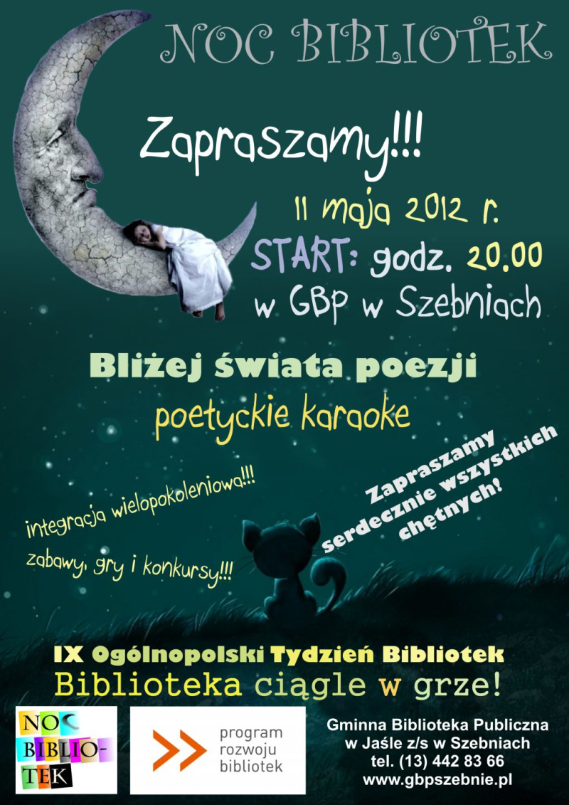 Gminna Biblioteka Publiczna w Jaśle z/s w Szebniach i jej Filie w Osobnicy, Trzcinicyi Warzycach zapraszają na IX Ogólnopolski Tydzień Bibliotek pt. „Biblioteka ciągle w grze!”.